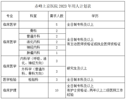 赤峰上京醫(yī)院2023年面向社會(huì)公開招聘專業(yè)技術(shù)人員33名。具體招聘計(jì)劃見下表: