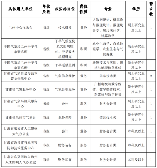 根據(jù)《氣象部門事業(yè)單位公開招聘應(yīng)屆高校畢業(yè)生管理辦法》和《甘肅省氣象部門事業(yè)單位公開招聘應(yīng)屆高校畢業(yè)生實(shí)施細(xì)則》的要求,為滿足甘肅省氣象局事業(yè)單位工作需要,本階段面向應(yīng)屆高校畢業(yè)生公開招聘工作人員11名,F(xiàn)就有關(guān)事項(xiàng)公告如下: